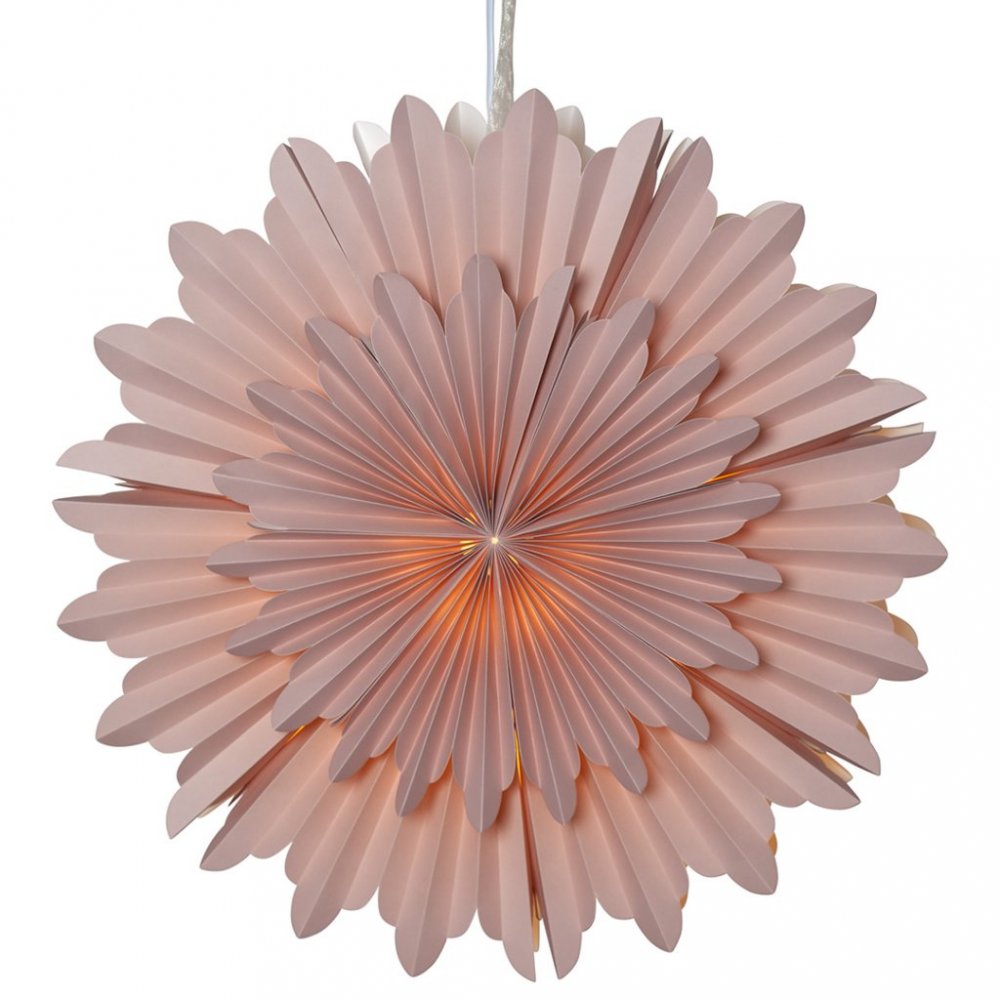 Otroligt vacker ljusrosa pappersstjärna, tillverkad av två lager veckat papper. Ojämna konturer för en vintrig och härlig känsla. Ett band ingår för att enkelt kunna hänga upp stjärnan i såväl fönster som på väggen.