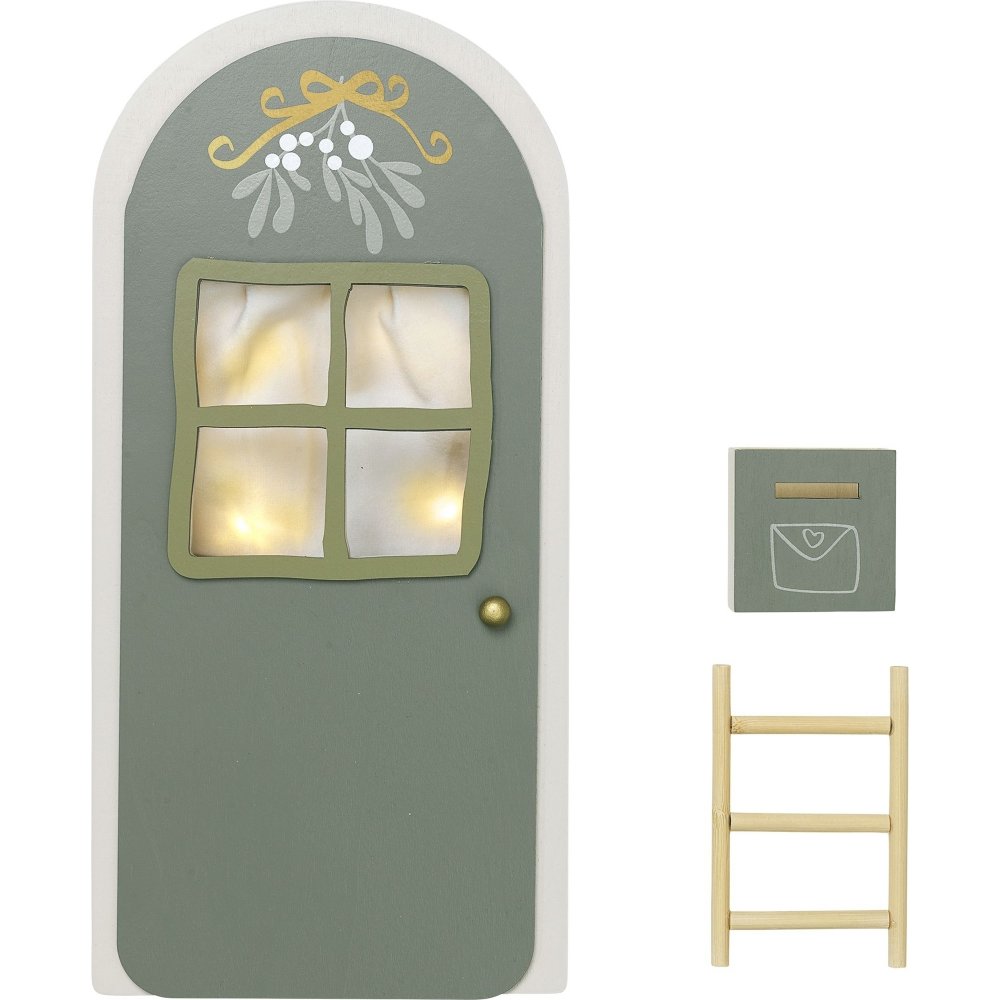 Liten söt grön nissedörr med LED-ljus samt postlåda och stege.