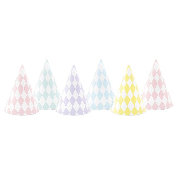 Finaste partyhattarna i härliga pasteller och harlequin mönster. En förpackning innehåller 6st hattar i olika färger.