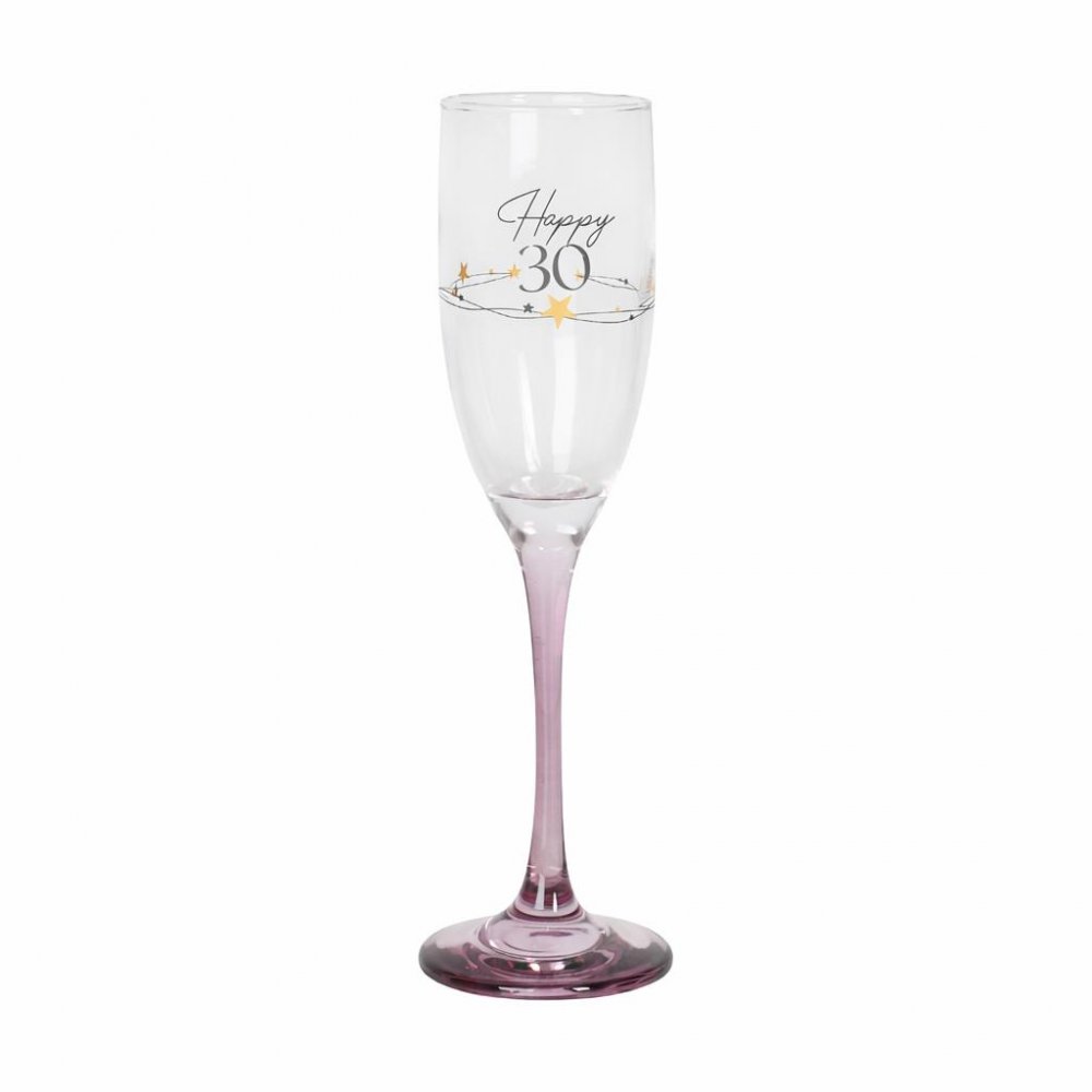 Ett gnistrande glas med texten Happy – 30 som blir den perfekta presenten för 30-årsfesten.