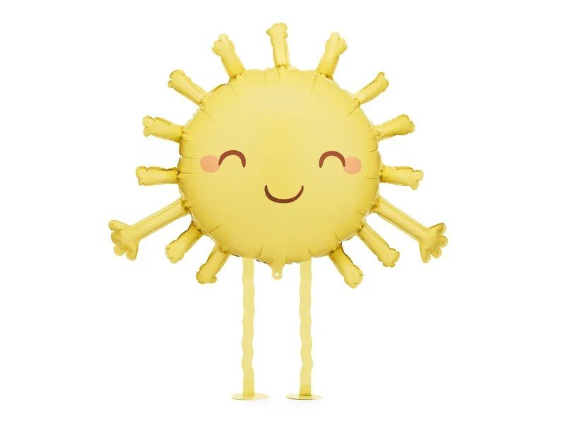 Folieballong formad som en bedårande sol, med små söta ben! Det ingår ett sugrör för att blåsa upp ballongen med, och den är tänkt att fyllas med luft.